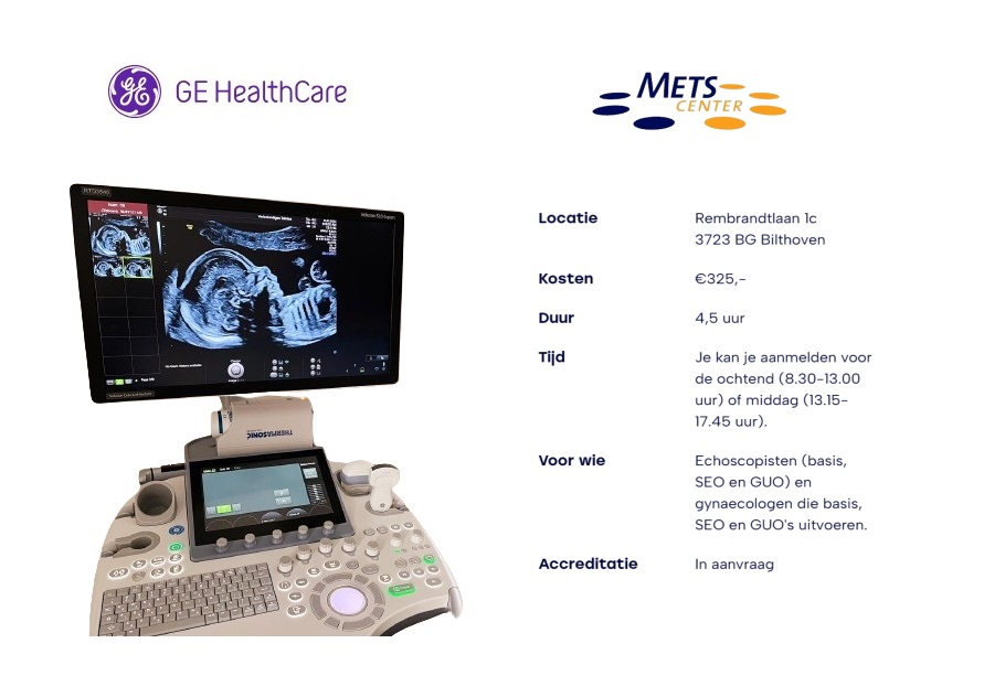 Dit is geen echosimulatie training, maar een initiatief van het METS Center in samenwerking met GE Healthcare. Je oefent gericht jouw vaardigheden op echo-apparatuur van GE en een medewerker van GE geeft tijdens de training een 3D demo.